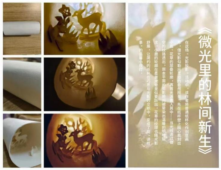 “万物向光·自然焕彩”光影设计活动鼓励学生以简单材料探索光与影的艺术魔力。同学们围绕“生命力”主题,在纸板上镂刻、绘制出向阳的向日葵、逐光的蝴蝶、破土的新芽等积极意象,再利用光源与自制投影装置,将图案投射于墙面。通过不断调试角度与距离,让光影下的自然元素焕发出清晰而动人的细节。学生通过形态塑造与光影构图,传递“追光而生”“向上成长”的精神内涵,实现了自然之美、艺术之趣与积极心智的有机融合。