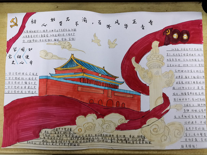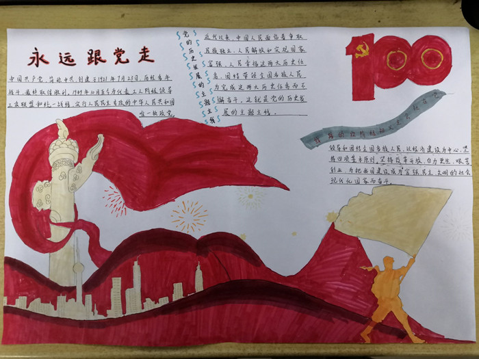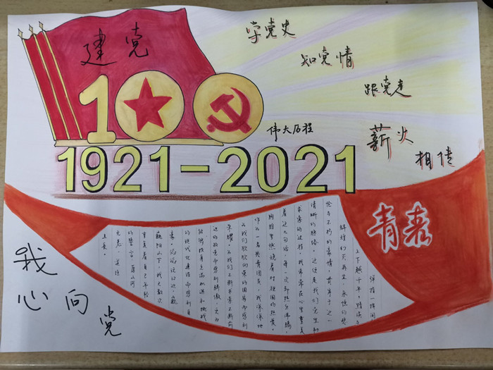 此次活动鼓励学生以手抄报为载体,引导学生不断增强民族自尊心、自信心和自豪感,唱响爱党、爱国、爱社会主义的时代主旋律。活动开展以来,各团支部在积极学习党史的基础上,通过查阅资料,认真规划手抄报内容,讨论架构、刊头及画面设计,绘出一批作品内容丰富,设计新颖的好作品。