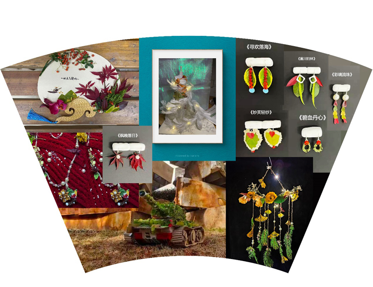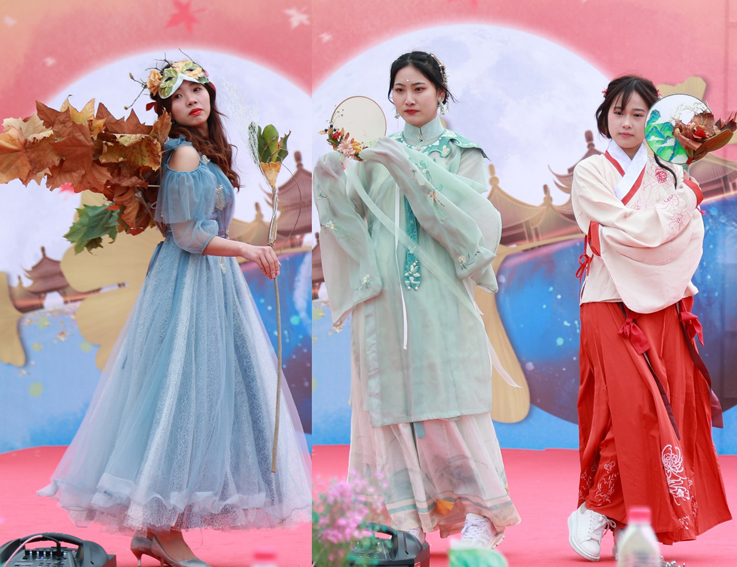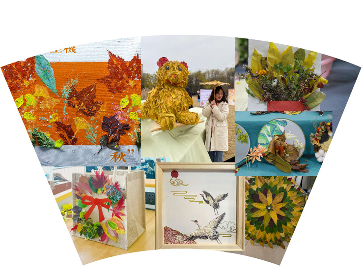 深秋的草坪像一块巨大的绒毯,同学们在草坪上搭建起了舞台,展示了以落叶为材料创作的时尚饰品、创意服装与艺术作品,不仅令台下的评委老师和观众称赞连连,更是吸引了路过的老师和同学,打造了一场视觉盛宴。