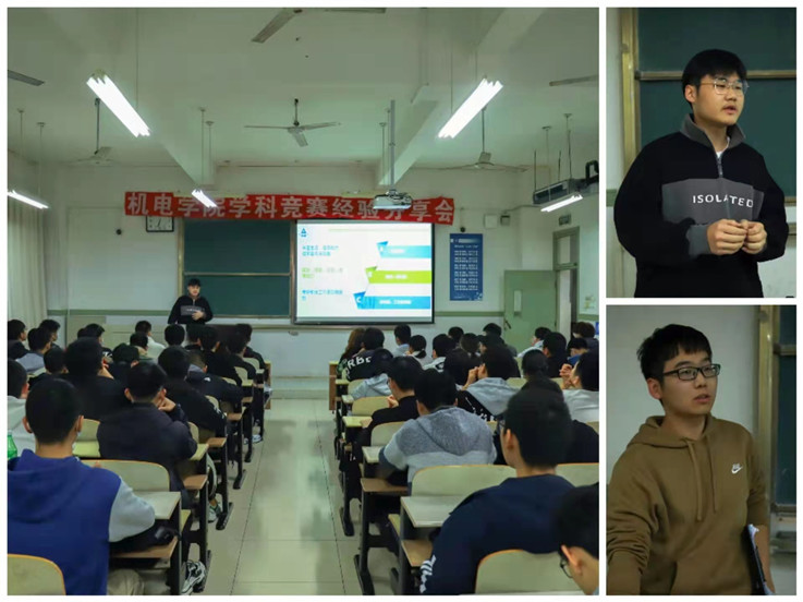 为增进大一新生对学科竞赛的了解,鼓励新生积极参加学科竞赛。机电学院邀请19机械黄忠豪同学、19电气闫新旭同学进行学科竞赛的经验分享。