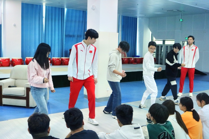在现场,吴斌、沈晨鹏为师生们示范击剑动作,亲自讲解了几项击剑运动的基础练习,现场气氛活跃、热情高涨。两位奥运健儿耐心回答师生提出的关于学习、竞赛与生活方面的问题,专业、耐心地传授宝贵经验,以身示范、现场教学,让大家受益匪浅,收获颇丰。课后,师生争先地与吴斌、沈晨鹏签名、合影。
