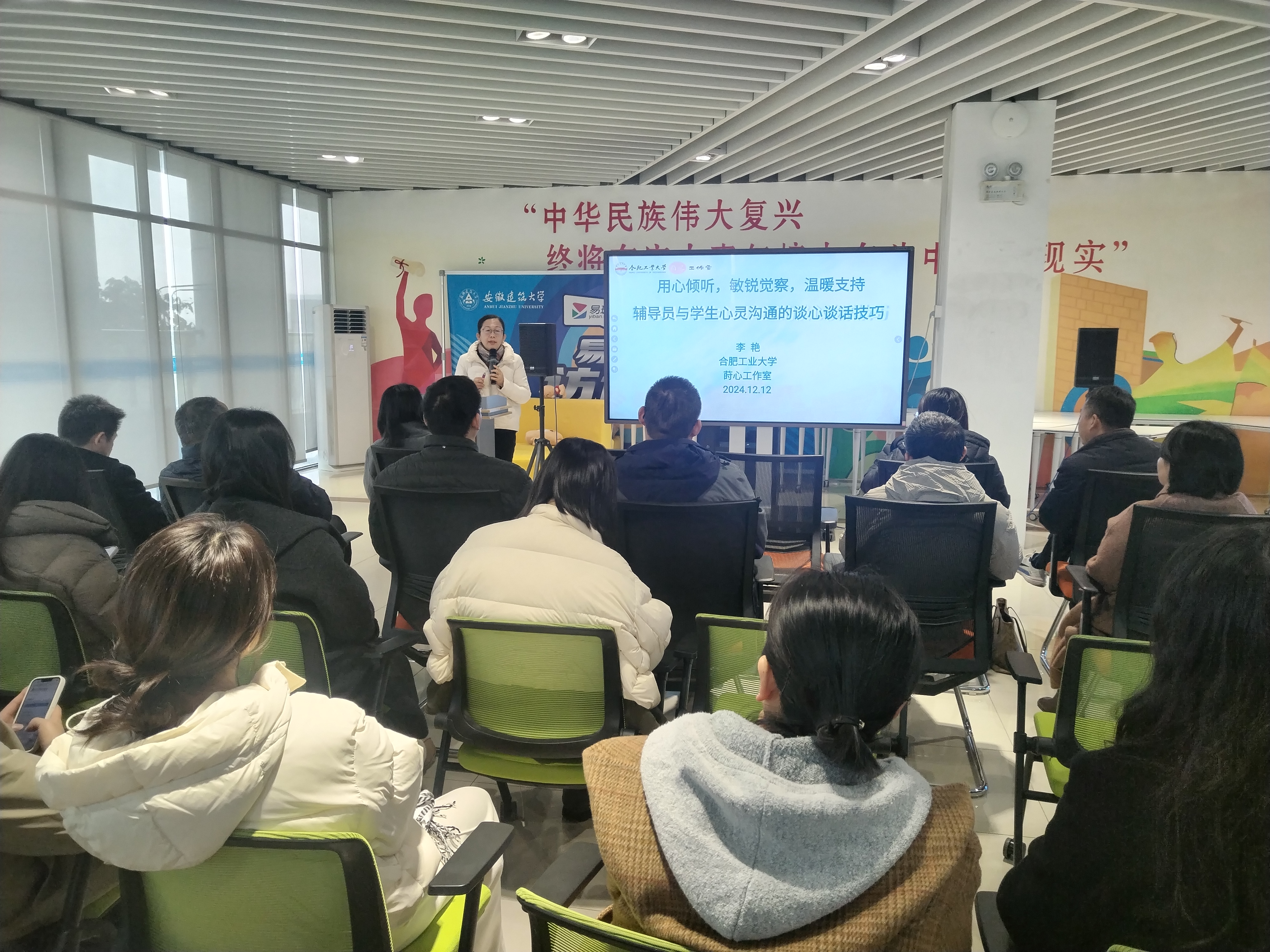 工作坊由学工部副部长主持,合肥工业大学李艳副教授担任主讲嘉宾,作为长期从事心理教育工作的专家,李艳副教授理论功底扎实,实践经验丰富,她介绍了谈心谈话中的倾听技术,以及谈话过程中如何通过语言交流和非言语观察对学生进行危机识别与评估,并分享了与不同心理问题学生的谈话要点。本次讲座形式多样,除了理论讲授,还包括了角色扮演、互动讨论和现场答疑的环节,使参与者能够在模拟情境中实践所学知识,加深了辅导员对心理辅导技巧的理解和应用,增强了他们应对实际问题的能力。