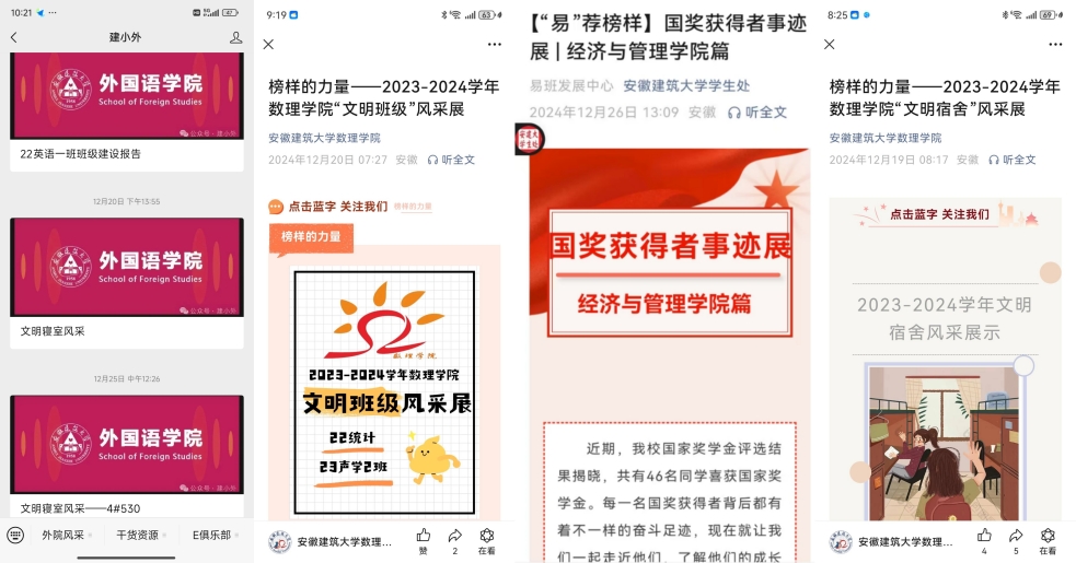 为激励广大学子以先进为镜、向优秀看齐,营造争先创优的良好氛围,学校相关部门高度重视、通力合作,协同推进表彰工作,通过“易荐榜样”、“易小班访谈室”、“事迹汇编”等形式大力弘扬先进学生成长案例。各学院注重实践创新能力培养,通过线上微信公众号、线下“经验分享会”等相结合的方式,展现了一批学习成绩优异、科研竞赛成果丰硕的学子风采。