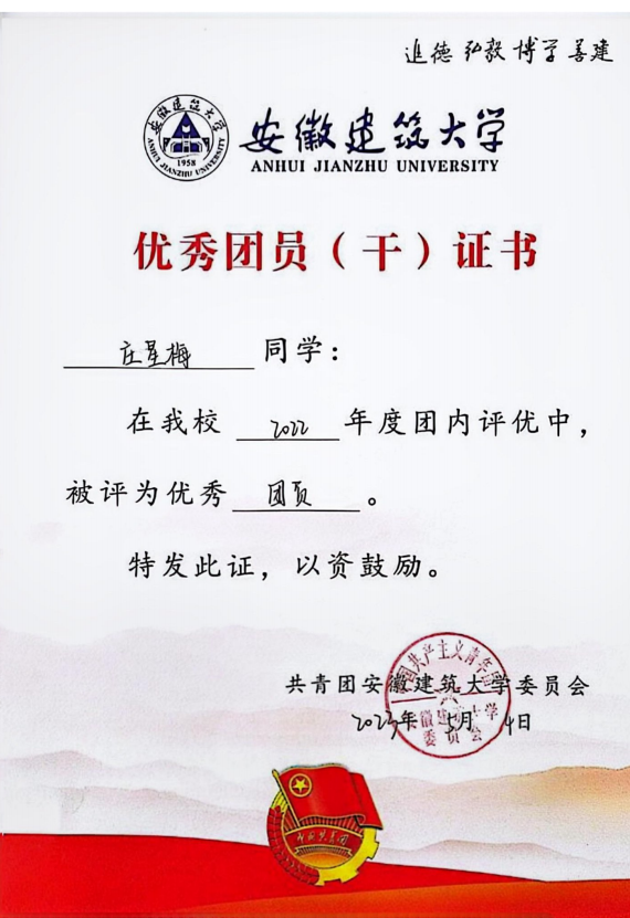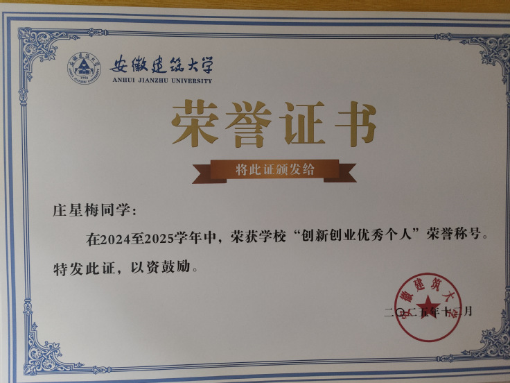 学习与科研之外,庄星梅还积极参与学生工作与社会实践,先后荣获“三好学生”“先进个人”“优秀团员”等荣誉称号,并连续三年获得校级学业奖学金。作为中共预备党员,她始终以高标准要求自己,在集体中发挥模范作用。在校期间担任2022级环境工程专业1班的学习委员与环能学院第五学生党支部党建助理。她在兼顾专业学习的同时,肩负起班级学习委员与学生党建助理的双重责任。作为学习委员,她关注每一位同学的学习状态,及时反馈学业难点,努力让集体的智慧流动起来,营造积极互助的求知氛围。与此同时,她协助支部书记整理汇总党员发展材料,组织理论学习和主题党日活动,亲身体会何谓“严谨细致”,何为“初心使命”。