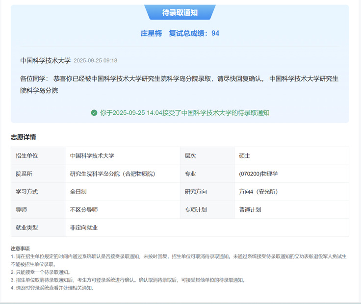 庄星梅的保研之路并非一条预先铺就的坦途。“那段时间,身边陆续有同学参加夏令营、联系导师,但我从没想过保研这条路,”她回忆道,“因为过去我们学校一直没有推免名额,我始终按考研的计划在准备。”九月,学院首次获得推免资格的通知正式下达,这份突如其来的机会,意味着她必须在一周内完成个人陈述、专家推荐信、成绩证明等一系列材料的准备,同时快速确定研究方向、联系导师,并准备多所院校的面试。“时间很紧张,压力也很大,”她坦言,“但八个月的考研复习没有白费,那些专业课知识让我在面对面试提问时更有底气。”凭借扎实的学科基础和清晰的表达,她陆续通过了中国科学技术大学、合肥工业大学等院校的考核,最终选择了中科大科学岛校区。