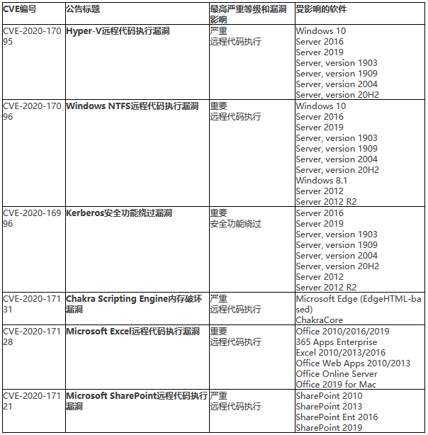 受影响的产品包括:Windows 10 20H2 & WindowsServer v20H2(20个)、Windows 10 2004 & WindowsServer v2004(20个)、Windows 10 1909 & WindowsServer v1909(19个)、Windows 8.1 & Server 2012 R2(6个)、Windows Server 2012(6个)、Microsoft Edge (HTML based)(2个)和Microsoft Office(15个)