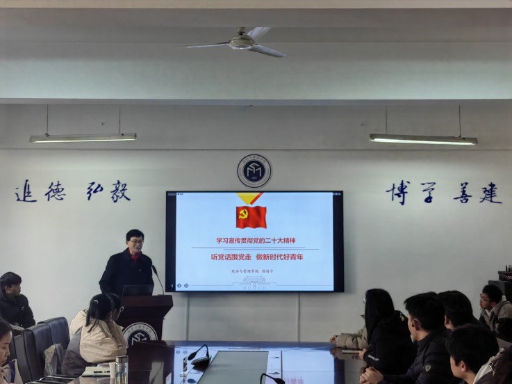 本网讯 12月27日,“学习党的二十大,建大青年在行动”党的二十大精神师生宣讲团(第4讲)走进经济与管理学院。经济与管理学院党委书记陈国中,公共管理学院辅导员、经管学院学生宣讲团、学生代表、学工部工作人员等100余人参加宣讲会。