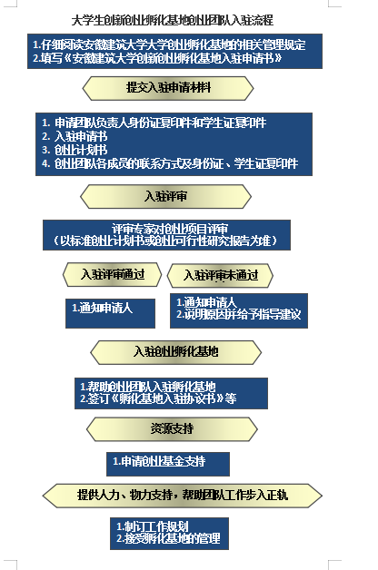 答:安徽建筑大学大学生创新创业孵化基地面向我校全体在校学生及毕业三年内校友开放。申请入驻团队需先向学校就业工作处提出申请,并提交创业企业(创业项目)相关资料。学校审核后,项目还需参加当年学校举办的大学生创新创业孵化基地入驻项目遴选曁创业大赛,并经大赛角逐及专家评定,方可入驻大学生创新创业孵化基地。其他入驻申请事宜可咨询就业工作处创新创业教育中心(0551-63828168)。
