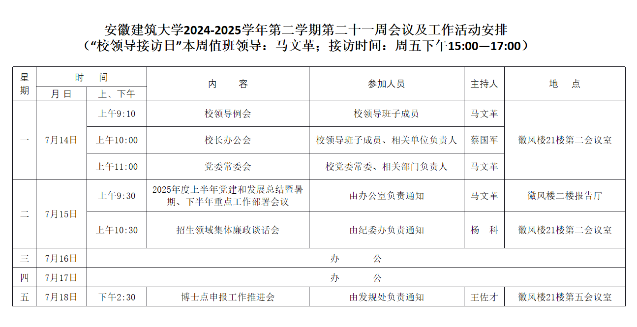 安徽建筑大学2024-2025学年第二学期第二十一周会议及工作活动安排