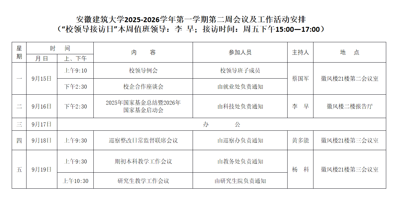 安徽建筑大学2025-2026学年第一学期第二周会议及工作活动安排
