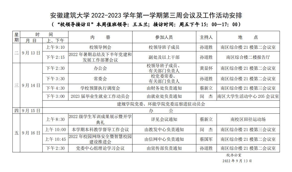 安徽建筑大学2022-2023学年第一学期第三周会议及工作活动安排