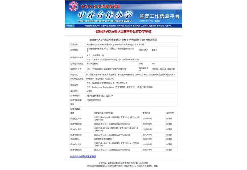 本网讯 近日,安徽省教育厅转发教育部国际合作与交流司《关于部分高校申请变更中外合作办学项目及内地(大陆)与港澳台合作办学项目申请变更事项的批复》(教外司办学[2022]53号),我校与美国中密歇根大学合作举办的环境设计(室内设计)专业学士学位教育项目变更申请成功获批。