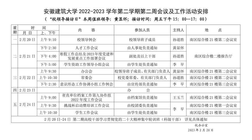 安徽建筑大学2022-2023学年第二学期第二周会议及工作活动安排