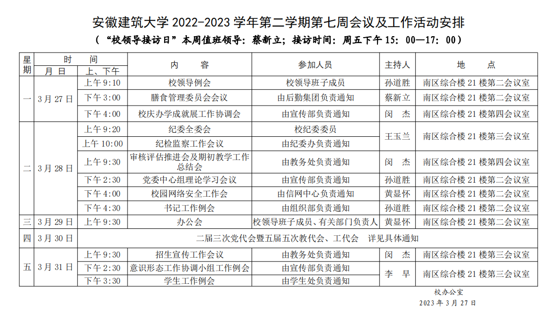 安徽建筑大学2022-2023学年第二学期第七周会议及工作活动安排