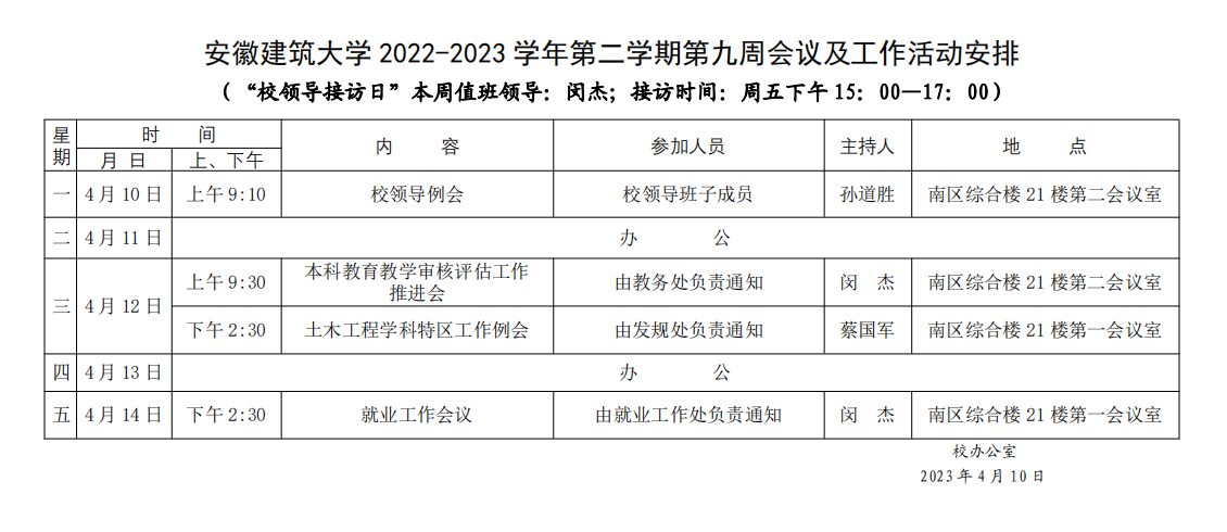安徽建筑大学2022-2023学年第二学期第九周会议及工作活动安排