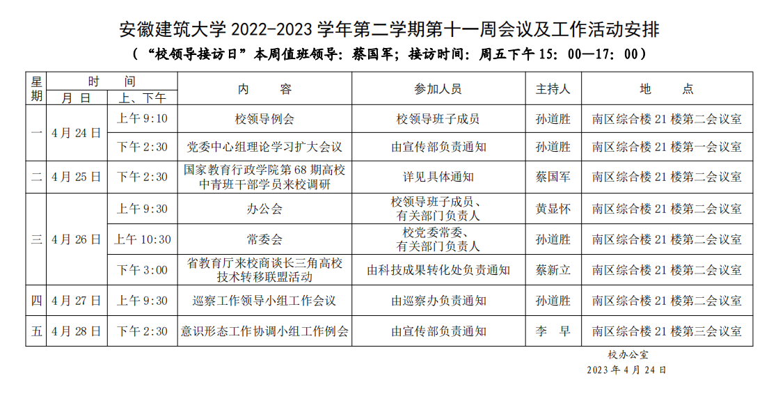 安徽建筑大学2022-2023学年第二学期第十一周会议及工作活动安排