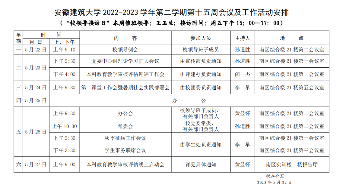 安徽建筑大学2022-2023学年第二学期第十五周会议及工作活动安排
