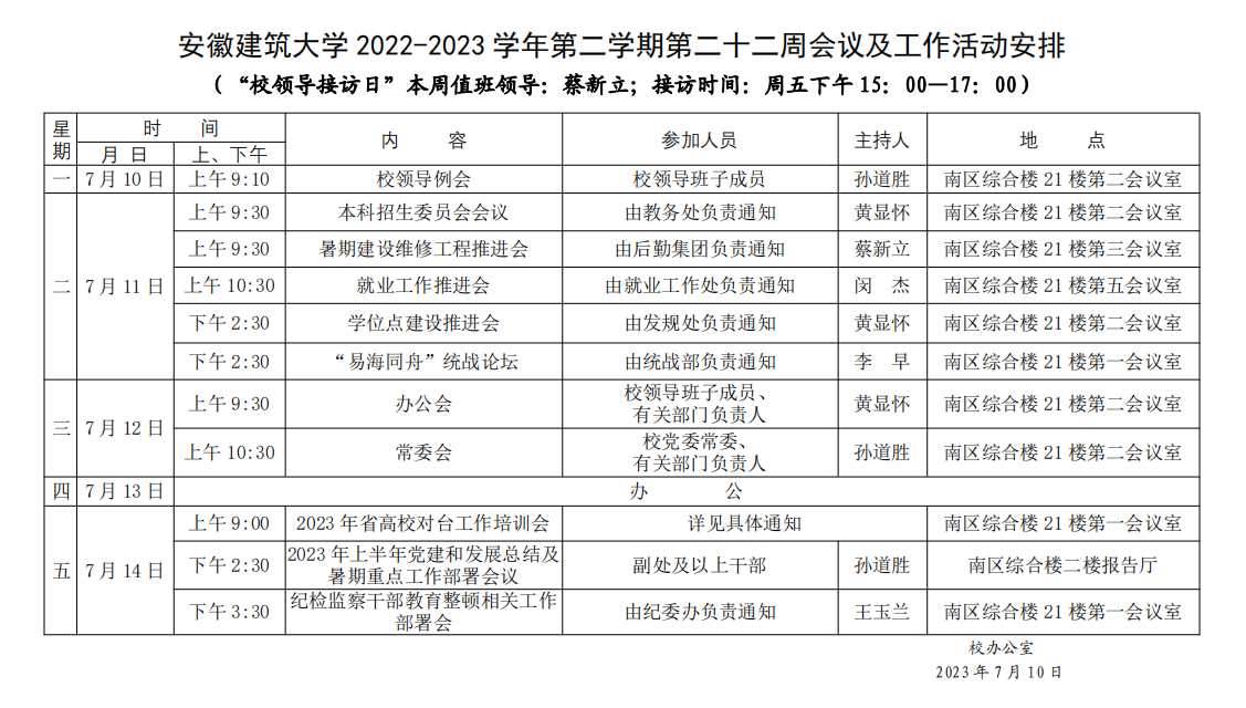 安徽建筑大学2022-2023学年第二学期第二十二周会议及工作活动安排