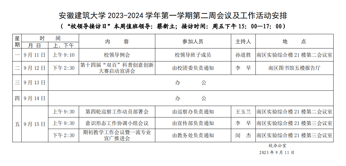 安徽建筑大学2023-2024学年第一学期第二周会议及工作活动安排