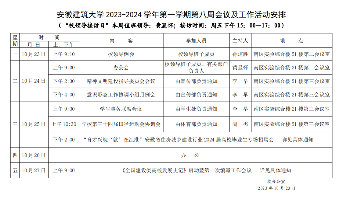 安徽建筑大学2023-2024学年第一学期第八周会议及工作活动安排