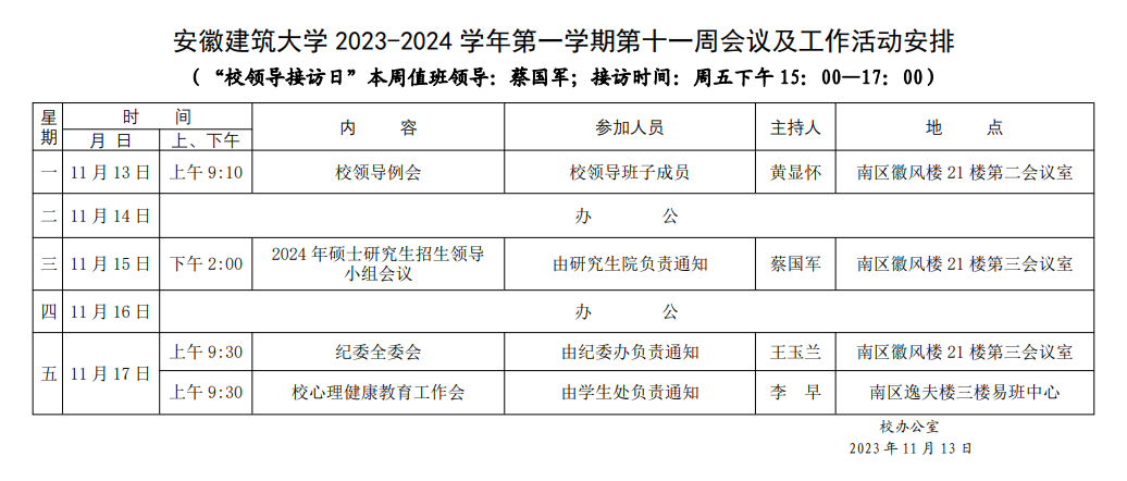 安徽建筑大学2023-2024学年第一学期第十一周会议及工作活动安排