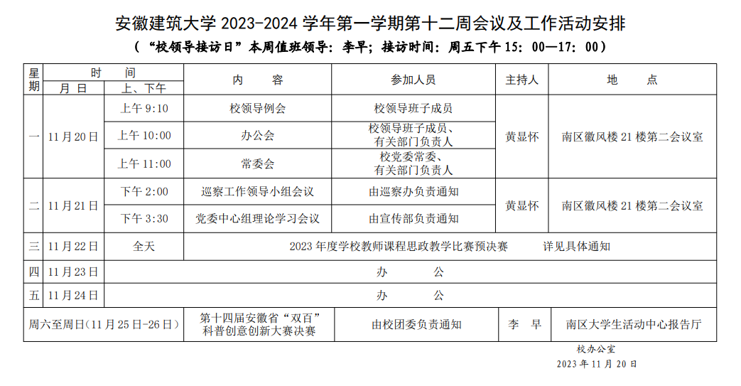 安徽建筑大学2023-2024学年第一学期第十二周会议及工作活动安排