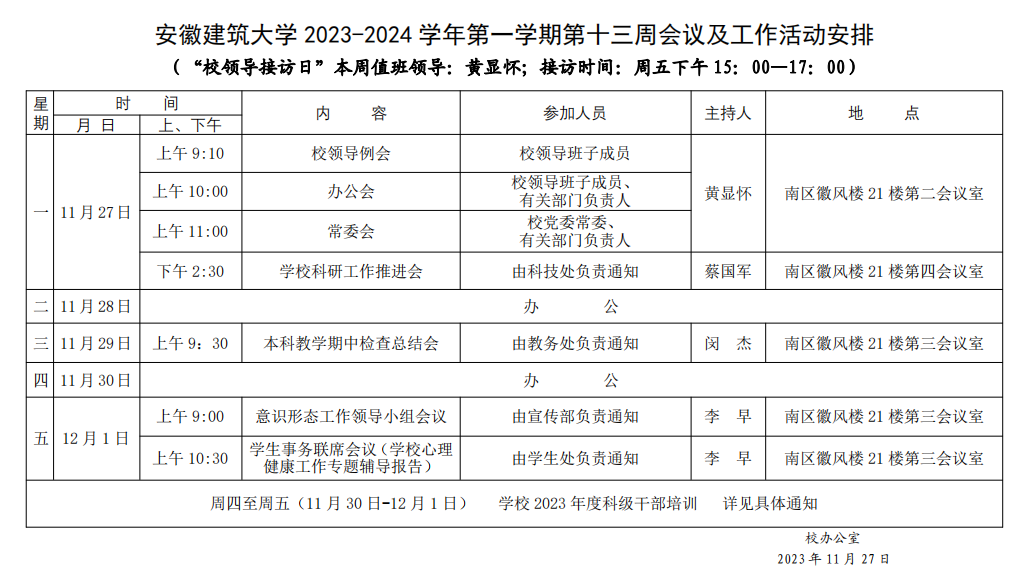 安徽建筑大学2023-2024学年第一学期第十三周会议及工作活动安排
