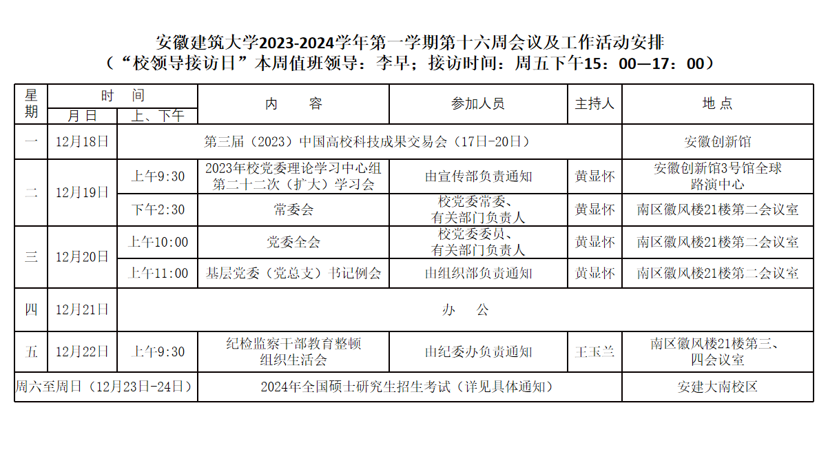 安徽建筑大学 2023-2024 学年第一学期第十六周会议及工作活动安排