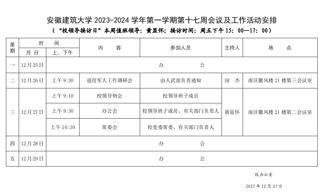 安徽建筑大学2023-2024学年第一学期第十七周会议及工作活动安排