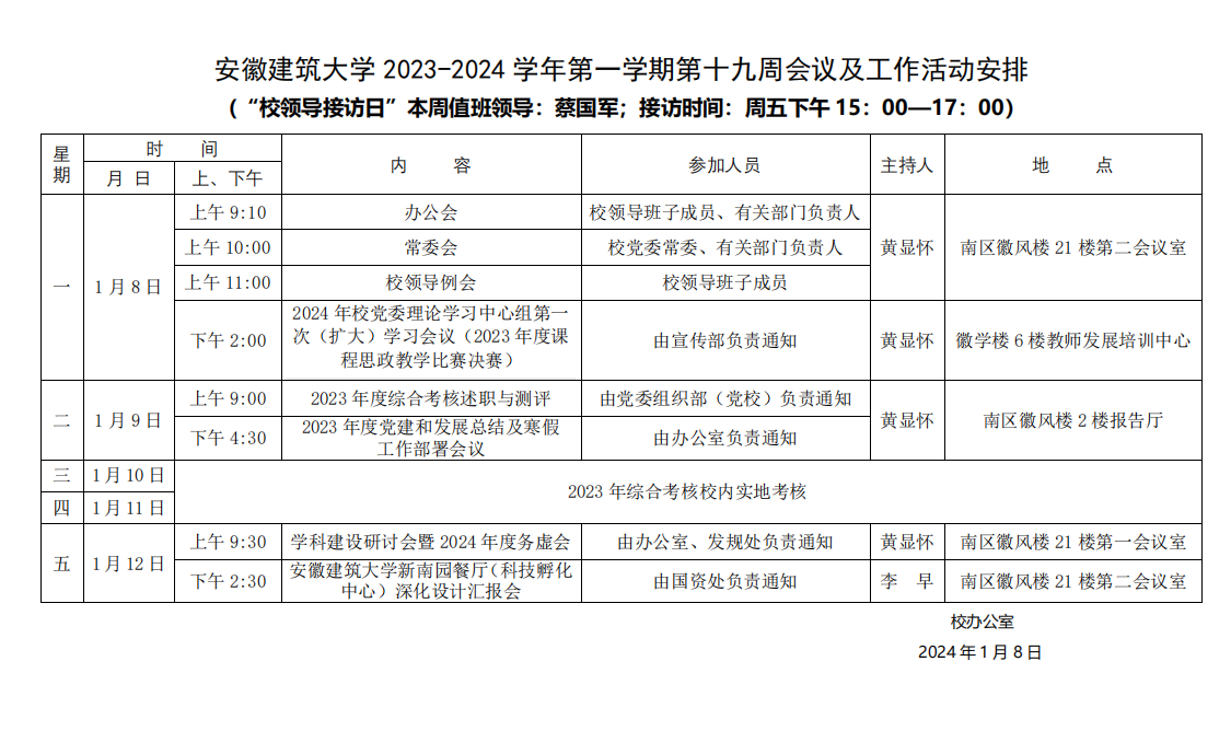安徽建筑大学2023-2024学年第一学期第十九周会议及工作活动安排