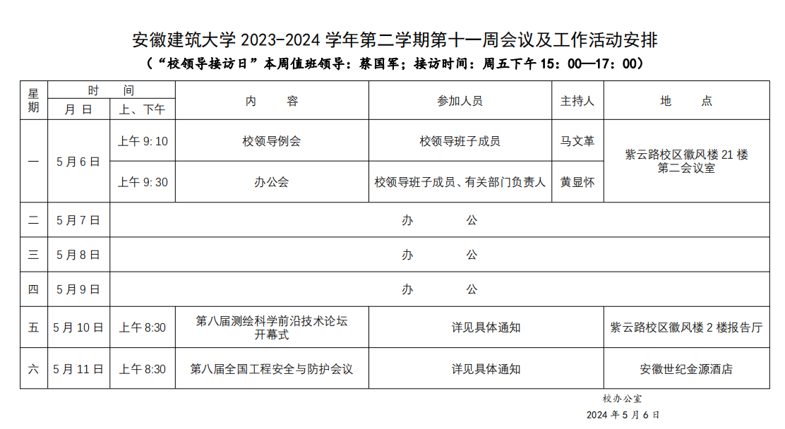 安徽建筑大学 2023-2024 学年第二学期第十一周会议及工作活动安排
