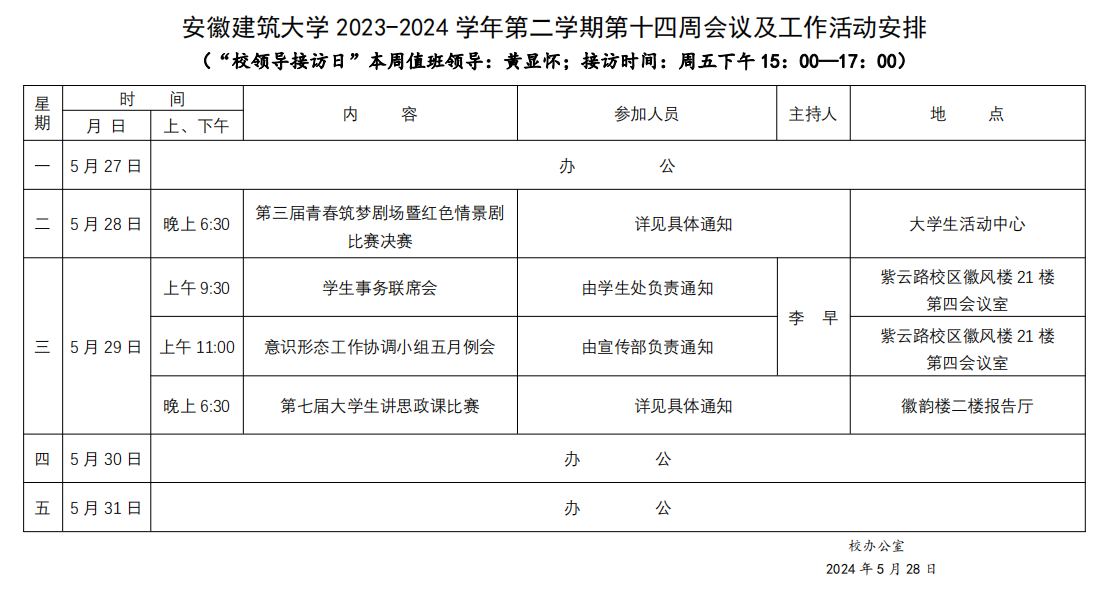 安徽建筑大学 2023-2024 学年第二学期第十四周会议及工作活动安排