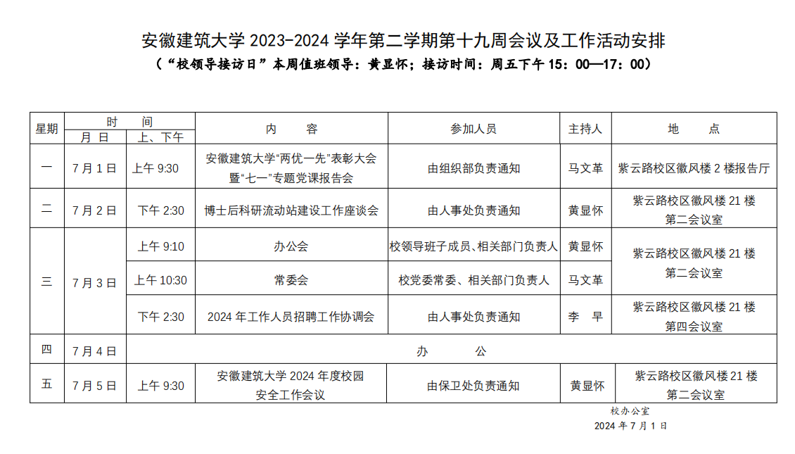 安徽建筑大学2023-2024学年第二学期第十九周会议及工作活动安排