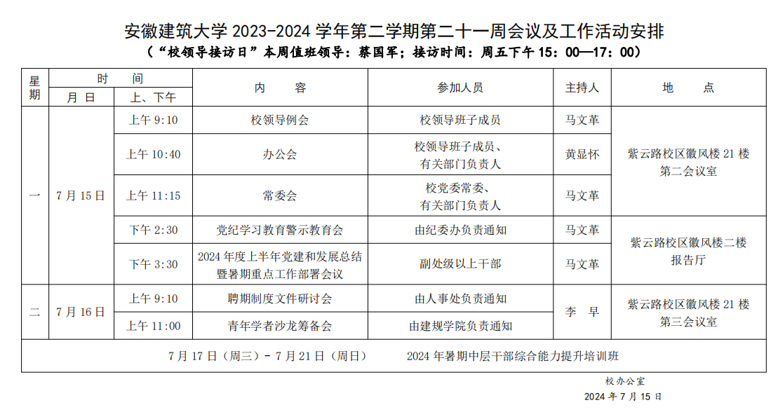 安徽建筑大学2023-2024学年第二学期第二十一周会议及工作活动安排