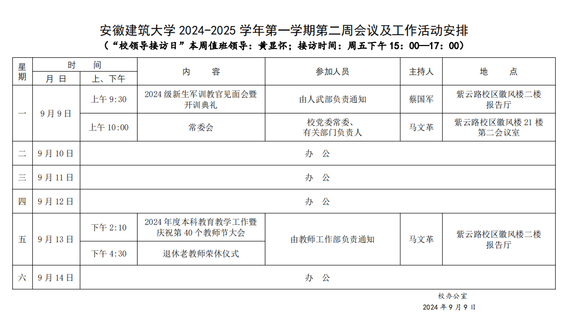 安徽建筑大学2024-2025学年第一学期第二周会议及工作活动安排