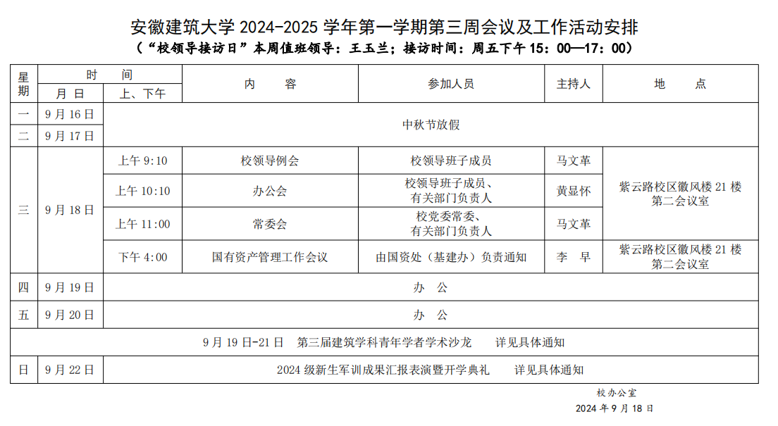 安徽建筑大学2024-2025学年第一学期第三周会议及工作活动安排
