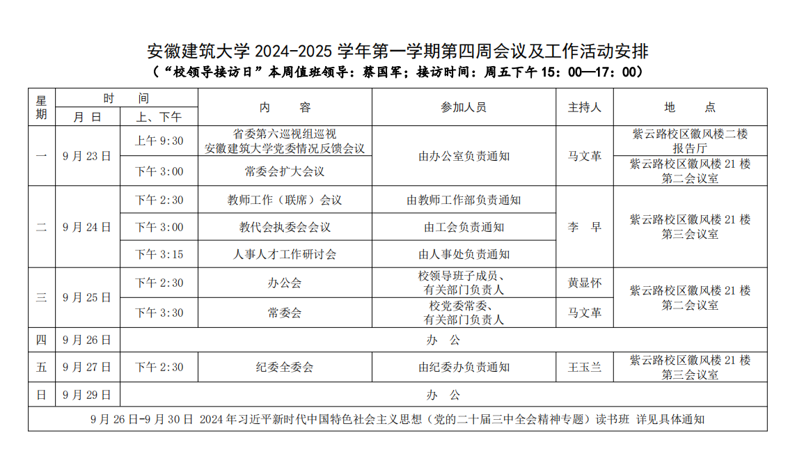 安徽建筑大学2024-2025学年第一学期第四周会议及工作活动安排