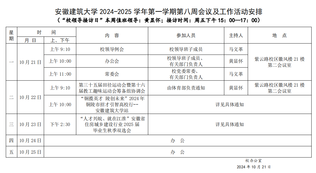 安徽建筑大学2024-2025学年第一学期第八周会议及工作活动安排