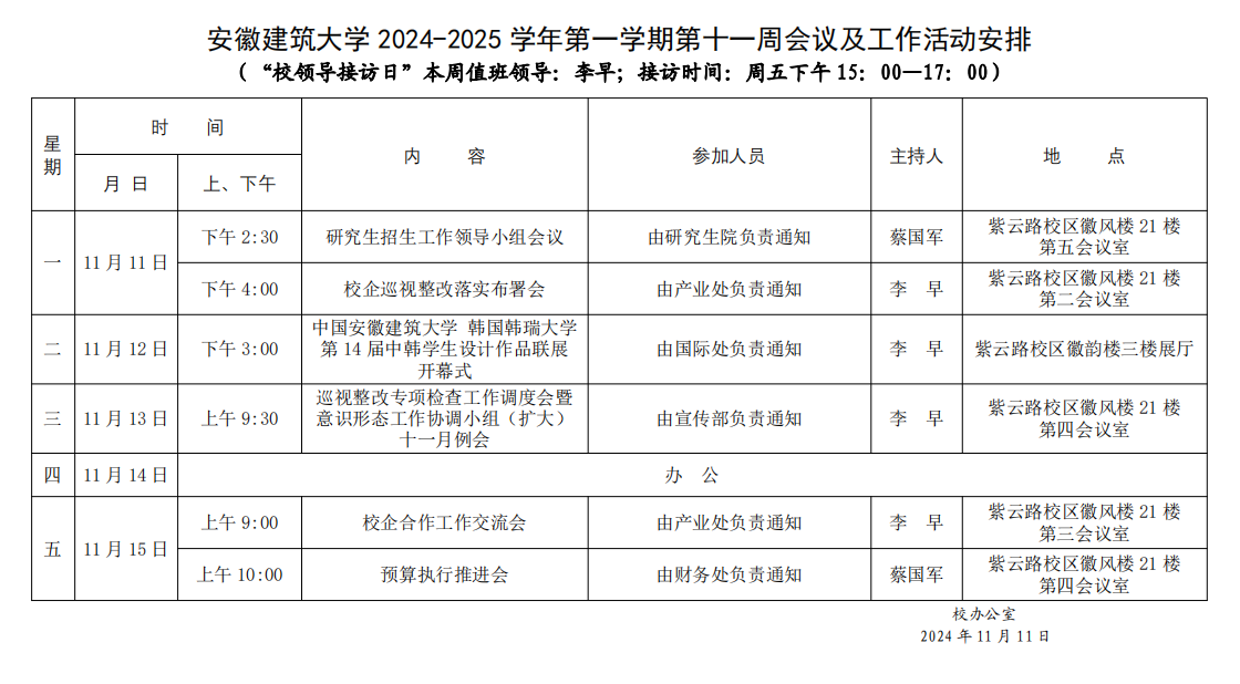安徽建筑大学2024-2025学年第一学期第十一周会议及工作活动安排