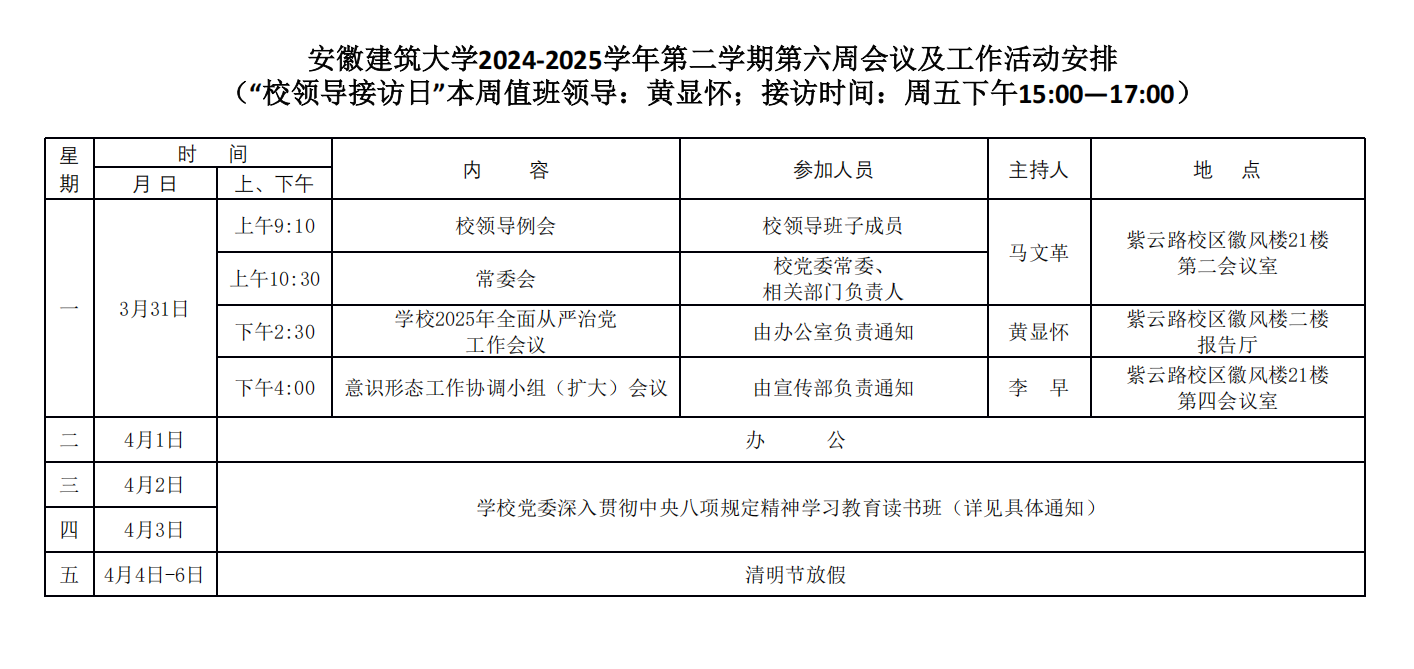 安徽建筑大学2024-2025学年第二学期第六周会议及工作活动安排
