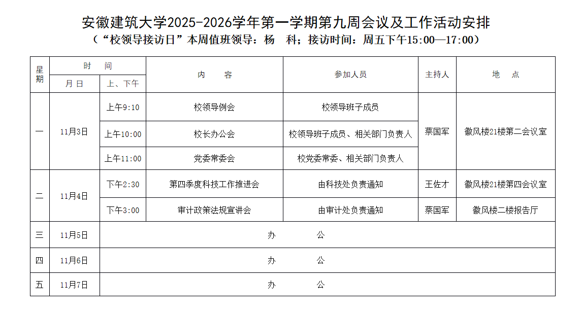 安徽建筑大学2025-2026学年第一学期第九周会议及工作活动安排