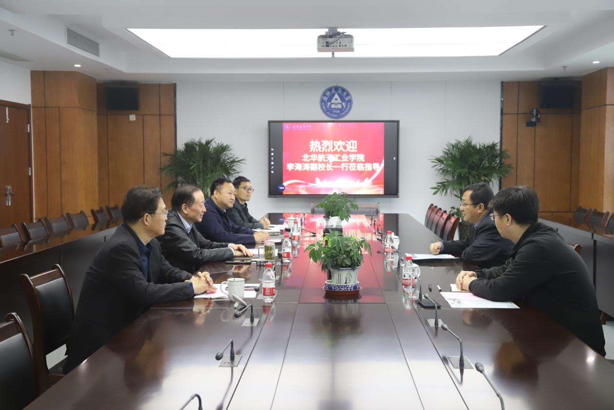 蔡新立对李海涛一行来访表示热烈欢迎,介绍了学校发展历程、建设规模、办学现状、未来发展等方面情况。李海涛对学校的热情接待表示感谢,并简要介绍了北华航天工业学院的发展情况,表明此次来访是希望学习借鉴我校关于新校区建设规划方面的经验事项。