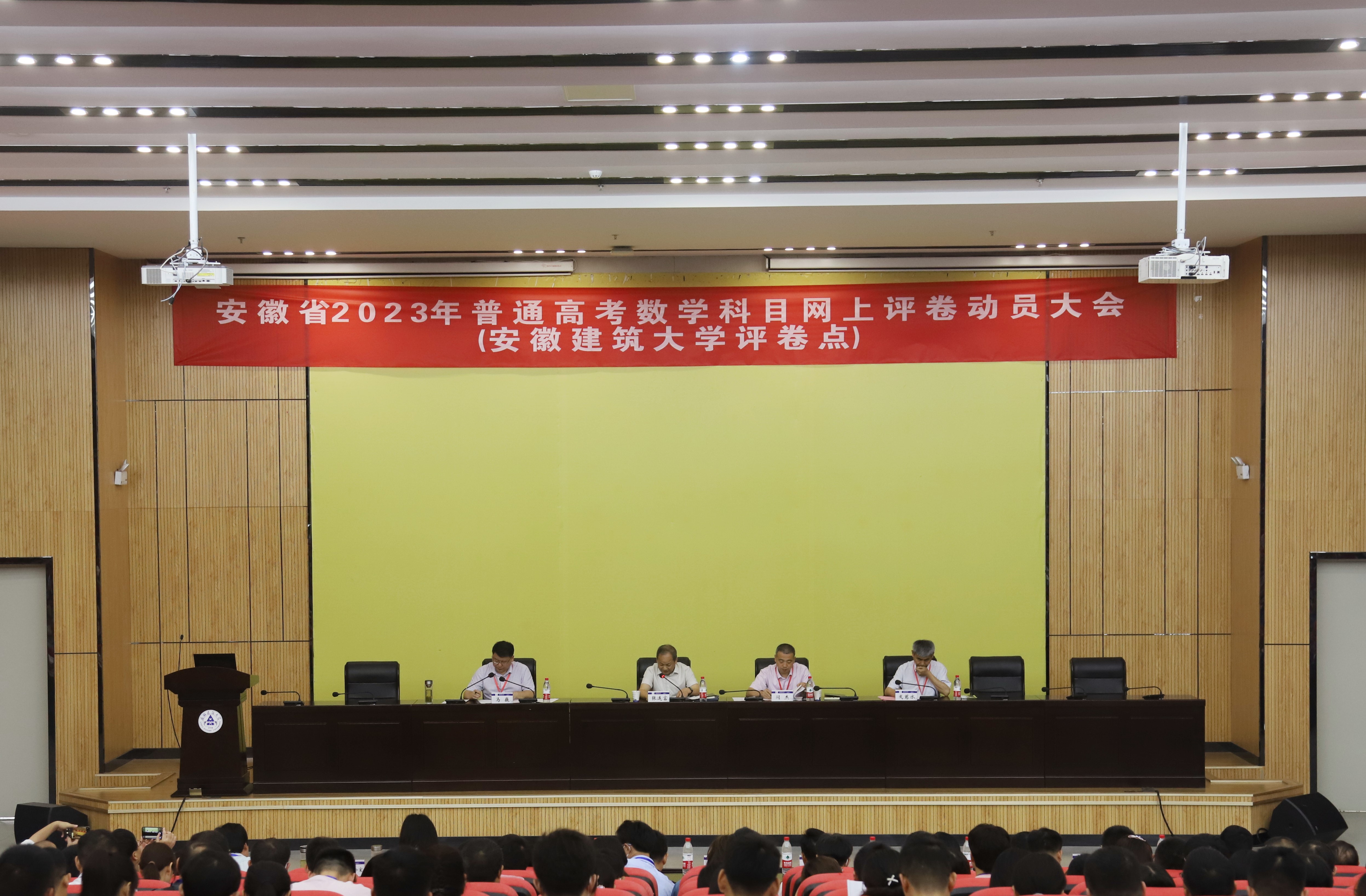 本网讯 6月11日,安徽省2023年高考数学科目网上评卷工作动员大会在安徽建筑大学南校区实验综合楼二楼报告厅举行,安徽省教育招生考试院副院长张连富、安徽建筑大学党委常委、副校长闵杰出席会议,省考试院派驻我校评卷点联络员、学校网评各工作组负责人和省内各中学评卷教师400余人参会。