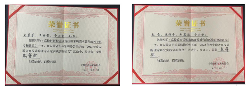 会议宣布了安徽省高校采购理论研究实践创新征文活动评选结果,招投标管理办公室送选的《高校科研仪器设备政府采购需求管理的若干思考和建议》和《高校政府采购市场开放对营商环境的挑战研究》在征文活动中分别荣获二等奖和三等奖。
