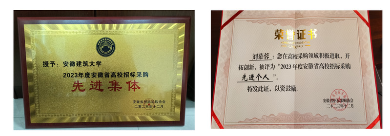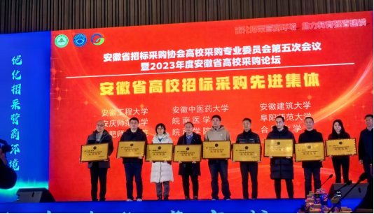 本次会议旨在深入贯彻落实党的二十大精神,推动高校采购工作改革创新,提高高校采购管理水平。会议宣布了高校采购专委会评选评优结果并颁奖。经高校采购专委会评审,安徽建筑大学在高校采购领域勤勉敬业、勇挑重担、团结互助,被评为“2023年度安徽省高校招标采购先进集体”;我校刘慕蓉同志在高校采购领域履职尽责、开拓创新、无私奉献,被评为“2023年度安徽省高校招标采购先进个人”。
