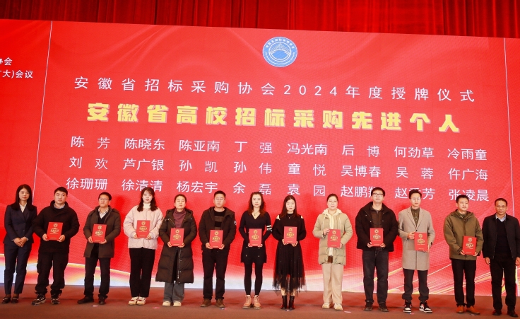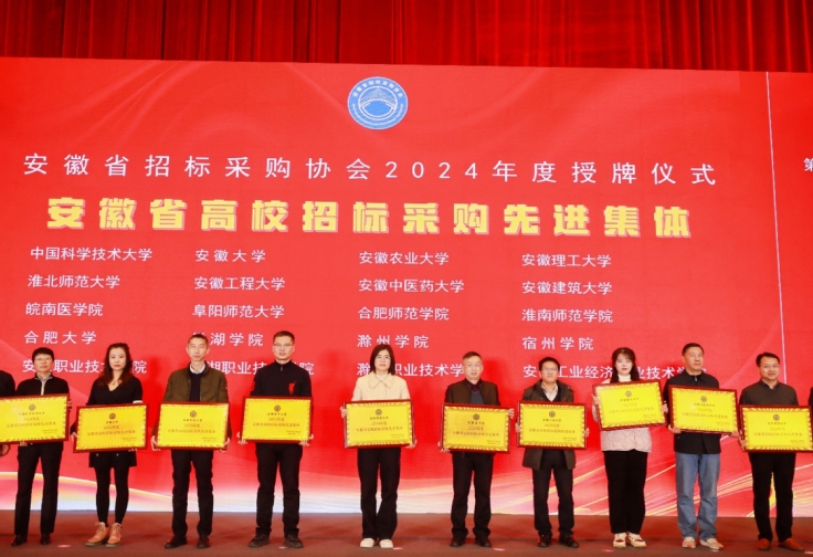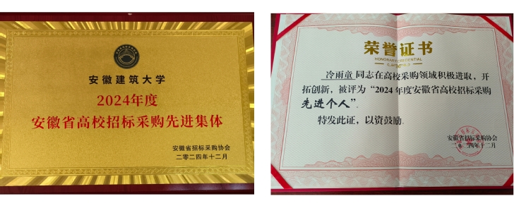 本次会议旨在贯彻党的二十大精神,推动高校招标采购工作高质量发展,会议宣布了高校采购专委会评选评优结果并颁奖。经高校采购专委会评审,安徽建筑大学被评为“2024年度安徽省高校招标采购先进集体”;我校冷雨童同志被评为“2024年度安徽省高校招标采购先进个人”。
