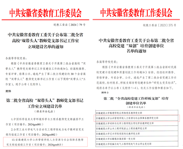 本网讯  近日,中共安徽省委教育工委发布《关于公布第二批全省高校“双带头人”教师党支部书记工作室立项建设名单的通知》,遴选建设全省高校30个 “双带头人”教师党支部书记工作室,学校公共管理学院人力资源与社会保障系教师党支部连瑞瑞工作室获批立项建设。