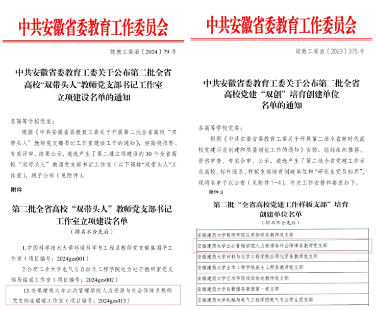 本网讯 2022年10月,学校党委遴选8个“双带头人”教师党支部书记工作室培育创建单位,公共管理学院人力资源与社会保障系(以下简称“人社系”)教师党支部连瑞瑞工作室获批立项建设;2024年2月,党支部被遴选为第二批全省高校“双带头人”教师党支部书记工作室立项建设单位。在学校及学院党委坚强领导下,人社系教师党支部扎实推进“双带头人”书记工作室培育建设,坚持“七个有力”,发挥“两个作用”,扎实推进党建工作和教育教学深度融合发展。通过创新实施“1-2-3-3-3”工作法,深化理论研究,创新活动载体,着力打造“红色管理”党建品牌,培育建设取得积极成效,人社系教师党支部获批省级新时代党建双创“样板支部”培育创建单位。